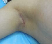 Scarless breast augmentation with 300 cc high profile implant transaxillary approach. The third set of photos shows a scarless breast augmentation (transaxillary incision at 3 months) performed by Dr. Pu.